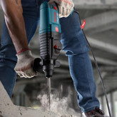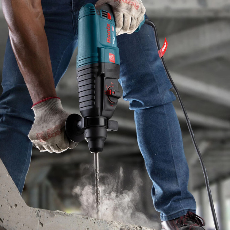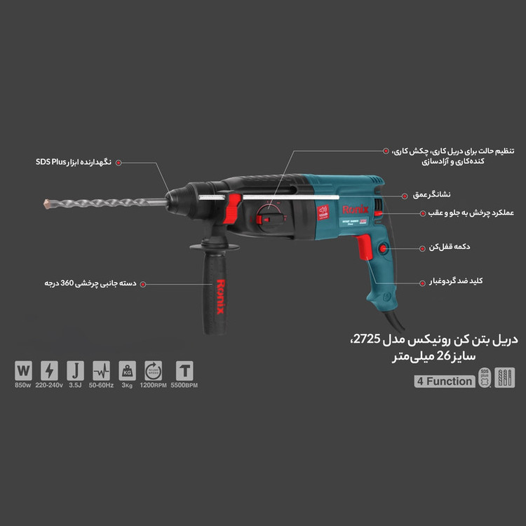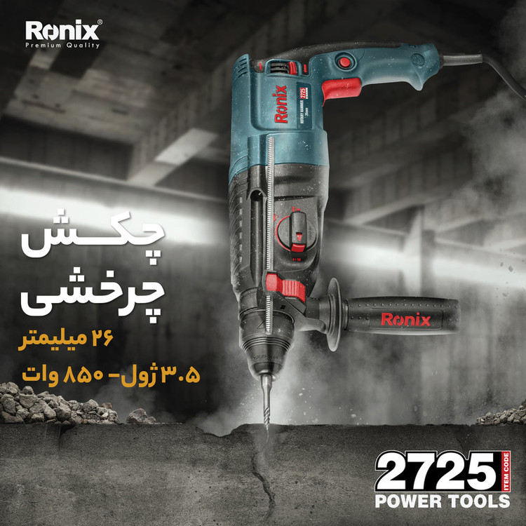 بتن کن برقی رونیکس مدل 2725 یکی از نمونههای با کیفیت و قدرتمند موجود در بازار کشور است. این دستگاه دارای موتور قدرتمند 850 واتی است که به آن این امکان را داده تا بتواند انواع سطوح و قطعات اعم از سنگ، چوب و فلز را چکشکاری یا سوراخکاری کند.بتن کن 2725 رونیکس سه حالت عملکردی دارد: حالت سوراخکاری، حالت چکشی و حالت همزمان سوراخکاری و چکشی. بر روی بدنهی این ابزار، یک سوئیچ سه وضعیته تعبیه شده که با چرخاندن آن میتوان وضعیت دستگاه را بر روی یکی از حالات فوق قرار دارد. وجود این سه وضعیت، کارایی دستگاه را تا حد زیادی بالا برده و به کاربر این امکان را داده تا بنا به نوع کار خود، از دستگاه برای چکشکاری یا سوراخکاری استفاده کند.این محصول رونیکس، توان مناسبی در وارد کردن نیرو به سطح کار دارد. حداکثر سرعت گردش بتن کن سه کاره رونیکس به 1200 دور در دقیقه میرسد و قادر است در هر دقیقه، حداکثر 5500 ضربه با انرژی 3.5 ژول به سطح کار وارد کند. متههای مناسب این دستگاه متههای با سایز 150× 7، 150× 8، 150× 10 و 150× 12 میلیمتر هستند.سیستم مته گیر این دریل بتن کن، به صورت SDS-Plus است و برای متههایی مناسب است که دنباله یا متهگیر آنها 4 شیار است. این قسمت مته گیر رونیکس روکش پلاستیکی دارد تا هم دوام آن افزایش یاید و هم تعویض مته، به شکلی سریع و راحت انجام شود.