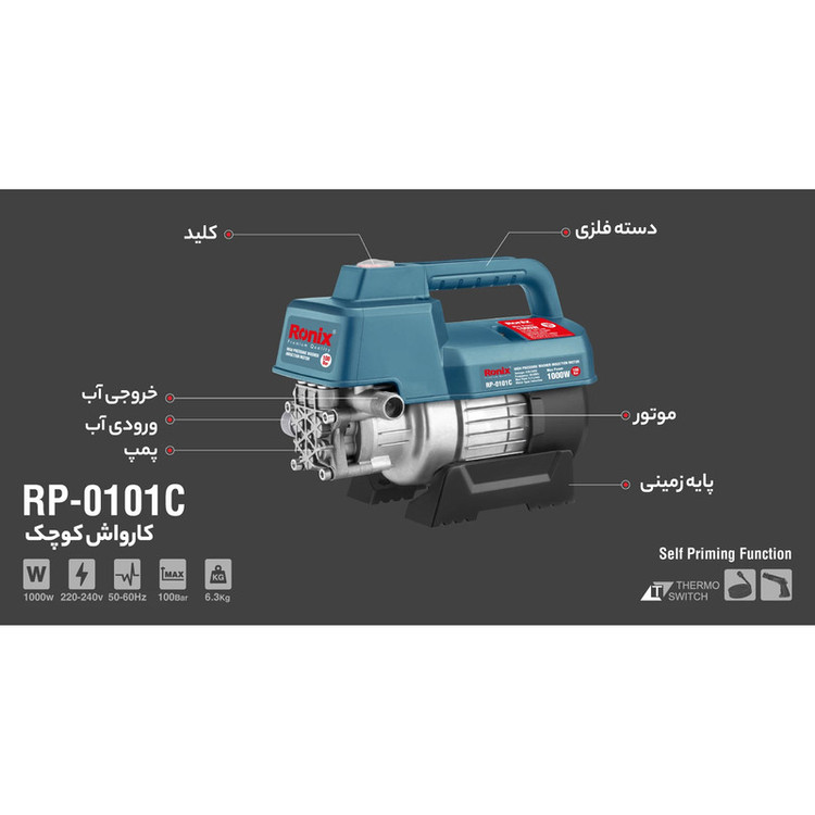 کارواش رونیکس (Ronix) مدل RP-0101C از قدرت و توان خوبی برخوردار است و با توجه به کاربرد آن در طیف گسترده ای از فعالیت ها به یک موتور اینداکشن مجهز شده است . این موتور از توانی برابر با 1000 وات برخوردار بوده و با تولید حداکثر فشار 100 بار این کارواش می توان میزان 5.2 لیتر آب را در دقیقه برای افراد فراهم کند . فاکتورهای مهمی که قبل از خرید این ابزار برقی مورد توجه قرار میگیرد ، صرفه جویی در مصرف آب و انرژی است . بنابراین در طراحی این محصول از یک سیستم سوئیچ اتو استاپ بهره برده شده تا با رها کردن ماشه آبپاشی فرایند پاشش آب به صورت خودکار قطع و موتور دستگاه متوقف شود . این سیستم علاوه بر صرفه جویی به افزایش طول عمر موتور کارواش کمک می کند . سیستم حفاظت گرمایی دیگر مکانیزمی است که در مدل RP-0101C رونیکس وجود دارد . این سیستم از داغ شدن موتور جلوگیری کرده و با بالا رفتن دما بیش از حد مجاز ، موتور را به صورت خودکار خاموش می کند . همچنین با پایین آمدن دما امکان استفاده مجدد برای کاربر فراهم می شود . در نتیجه این فرایند باعث محافظت از قطعات داخلی دستگاه و افزایش طول عمر آن خواهد شد . از ویژگی های بارز کارواش 100 بار دینامی می توان به برخورداری از لانس های قابل تنظیم ، تفنگ آبپاش پیشرفته ، شلنگ جمع کن ، فیلتر صافی آب و کوپلر اتصال سریع اشاره کرد . طراحی جمع و جور و وزن سبک از دیگر پارامتر های با اهمیت برای انتخاب کارواش است .