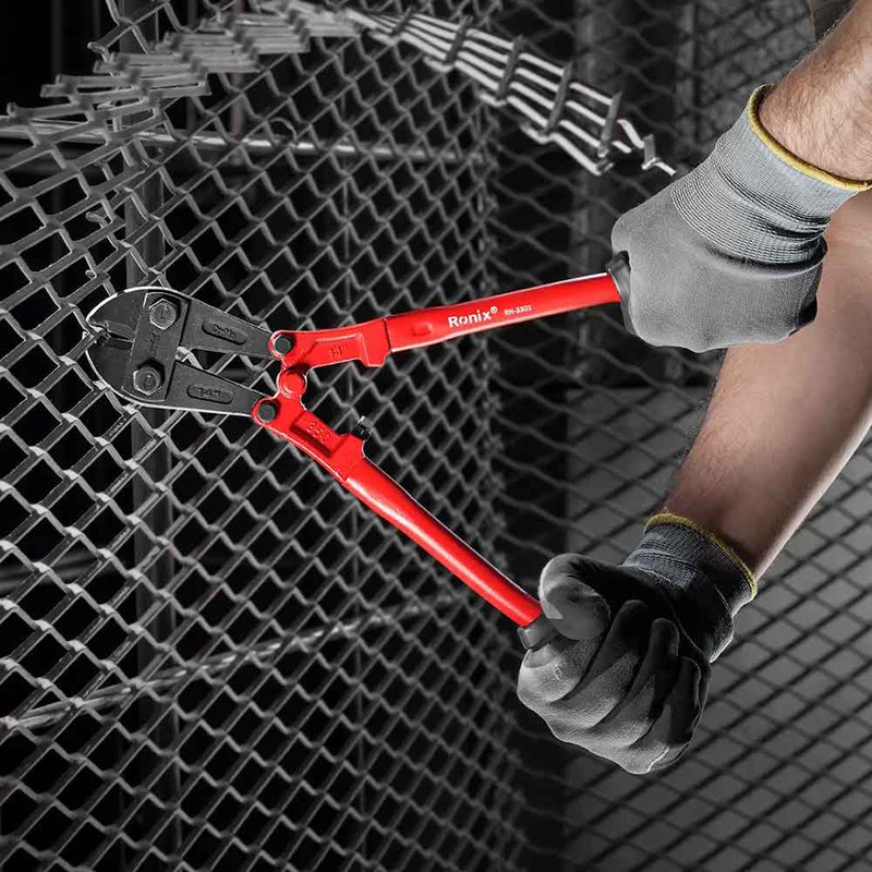 قیچی مفتول بُر یکی از ابزارآلاتی است که در جعبه ابزار بیشتر افرادی که مشغول کارهای صنعتی هستند، پیدا میشود. از این ابزار قدرتمند برای بریدن انواع زنجیر، پیچها و مهرهها، انواع توری و هر قطعه فلزی ضخیمی استفاده میشود. مفتول بُر سایز 14 اینچ رونیکس مدل RH-3301، دارای فکهای برشی سخت کاری شده از جنس کروم مولیبدن به منظور ایجاد برشهای تمیز و دقیق است.