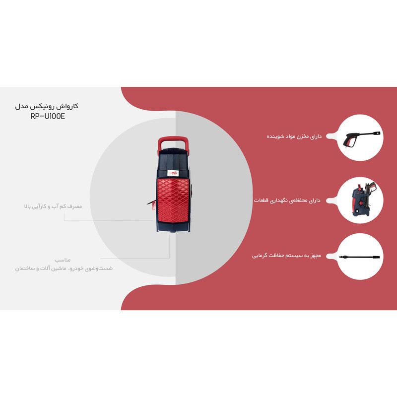 از کارواش جهت شستوشوی خودرو، اطراف ساختمان و غیره استفاده میشود. عملکرد این دستگاه بهصورتی است که با افزایش فشار آب به شستوشوی سریع و صرفهجویی در مصرف آب کمک میکند. کارواش «Ronix» «رونیکس» را مشاهده میکنید که با مدل (RP-U100E) با وزن 4.2 کیلوگرم به بازار عرضه شده است. این محصول دارای موتور یونیورسال است که توان آن 1400 وات، قدرت فشار آب آن 100 بار و حداکثر دمای آب آن 40 درجه سانتیگراد است. طول شلنگ آن 5 متر و دبی آن 6.5 لیتر در دقیقه است. کارواش رونیکس مجهز به یک عدد لنس توربو و یک عدد لنس قابل تنظیم بوده و از دیگر مشخصات این محصول میتوان به تفنگی قفلدار، قابلیت نگهداری متعلقات روی دستگاه، دستهای به طول 10 سانتیمتر جهت حمل آسان، قطعه گوپلینگ، سرشلنگی، سوزن تمیزکننده نازل و منبع مایع شوینده اشاره کرد. این کارواش مجهز به کلید اتوماتیک جهت خاموش و روشن کردن دستگاه است که باعث افزایش طول عمر دستگاه میشود.